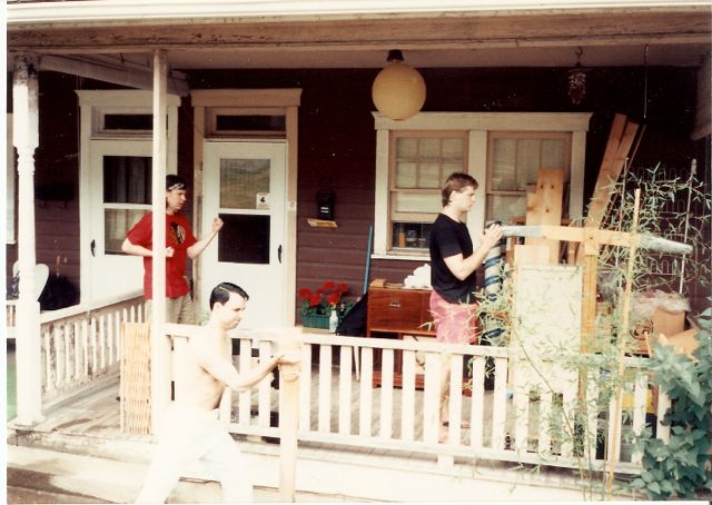 Frank Quinn practices Sanchin while Tim Chasey steadies the kaketebiki, an old Okinawan training device.