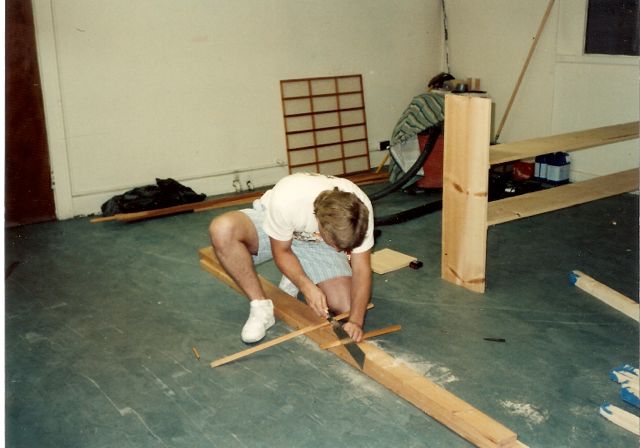 Tim Chasey applies his engineering skills to the future shoe rack, using a Japanese saw for the first time. "When I push, it doesn't do anything!"